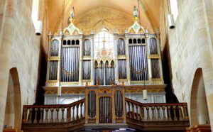 Kapłan klęczący przed tabernakulum w prezbiterium katedry św. Michała w Alba Iulia (Rumunia, lipiec 2024)